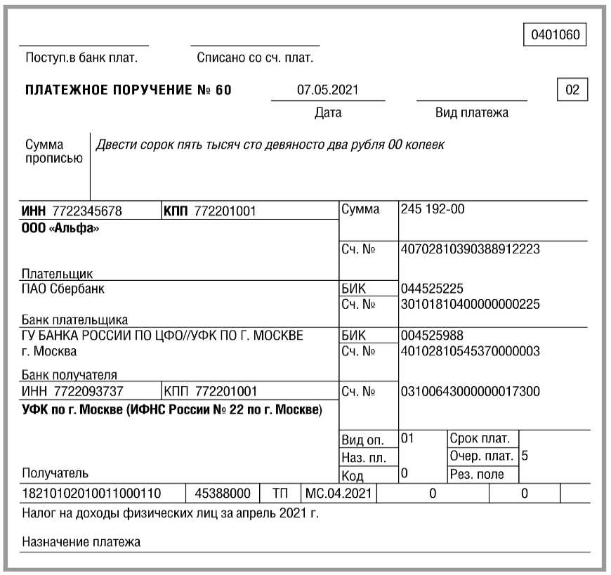 то обязанность по уплате взносов считается не исполненной. Остальные ошибки не препятствуют перечислению денег в бюджет. Значит не приведут к начислению пеней. К таким недочетам относятся: неправильный ИНН или КПП получателя. Уплата налогов: по каждому сроку перечисления нужно составить отдельную платежку Если компания в один день перечисляется НДФЛ с зарплаты и с отпускных. То и на зарплатный, и на отпускной НДФЛ нужно заполнить свое платежное поручение. Письмо ФНС от 12.07.2016 № ЗН-4-1/12498@ Как разъяснила ФНС, если законодательством предусмотрено более одного срока уплаты налога. И при этом для каждого из сроков установлены конкретные даты перечисления платежа. Налогоплательщик должен сформировать отдельную платежку по каждому из сроков. Ведь установленный законодательством срок перечисления налога следует указать в поле 107 платежного поручения.