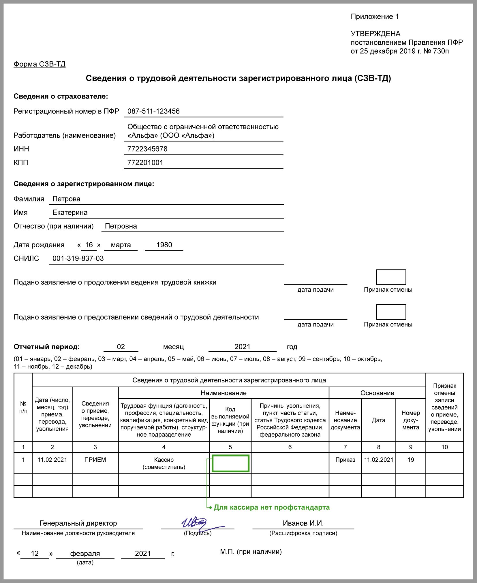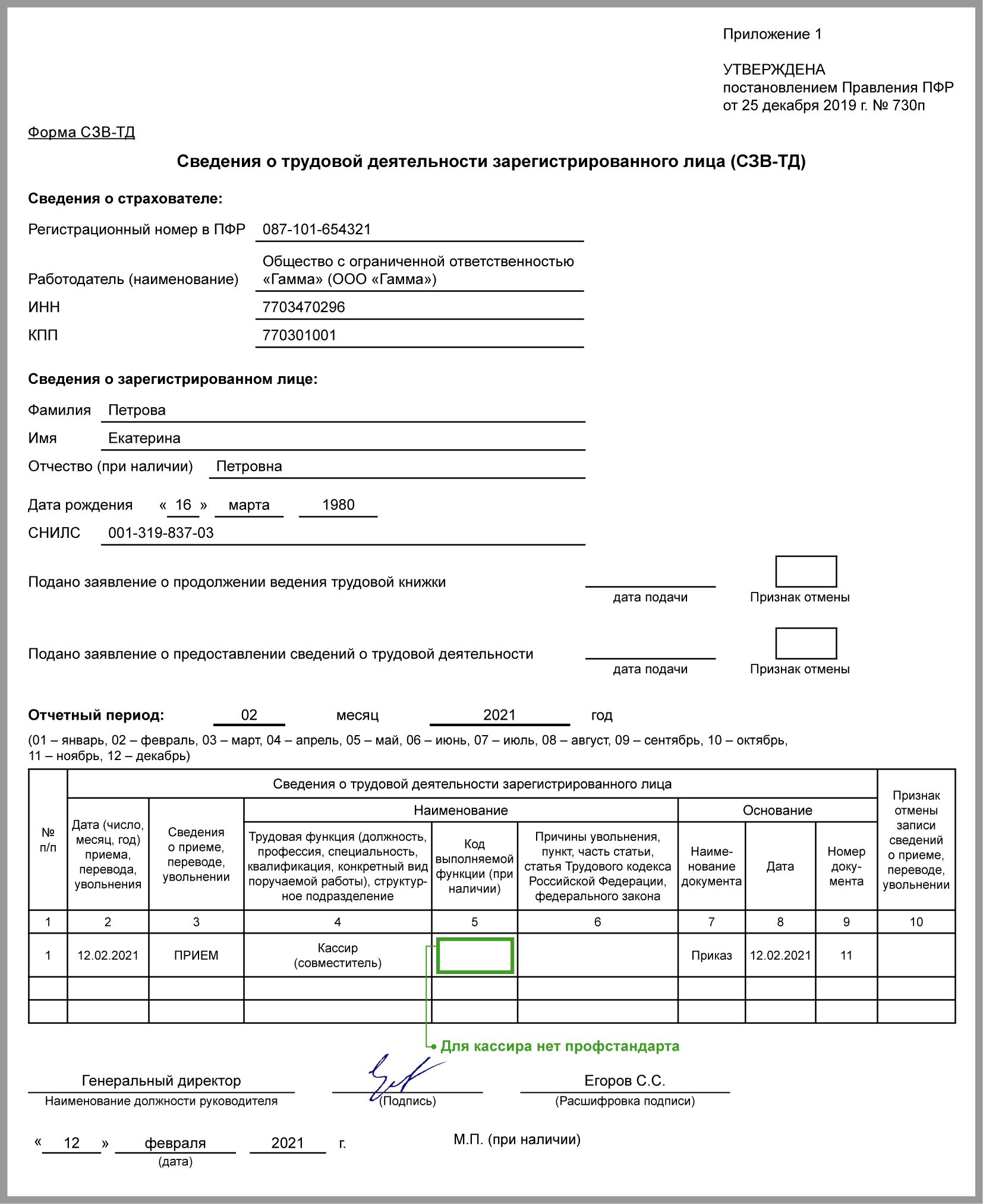 Электронная трудовая книжка (ЭТК) не предполагает физического носителя. И будет реализована только в цифровом формате. Просмотреть сведения современной книжки можно будет в личном кабинете на сайте Пенсионного фонда России. Или на портале Госуслуг. А также через соответствующие приложения для смартфонов. Россияне, которые до конца 2020 года не подадут заявление работодателю о сохранении бумажного документа , получат ее на руки. Сведения об их деятельности начиная с 2021 года будут формироваться только в цифровом формате. Как заполнить СЗВ‑ТД на совместителяСведения о работе по форме электронной трудовой составляются на каждого сотрудника. С которым заключен договор. В том числе на тех, кто работает по совместительству. О том, как заполнить форму в отношении совместителей, специалисты ПФР сообщили. В письме от 05.03.20 № В-6181-19/10665-20. Специфика ведения кадрового учета в отношении совместителей заключается в том, что документы таких сотрудников хранятся по месту основной работы. Соответственно, сведения в документ о работе с других мест работы вносит только основной работодатель. Таким образом, в отношении этих лиц. В графе 4 «Трудовая функция» табличной части формы электронной трудовой нужно указать на совместительство. При этом отметки в строках «Подано заявление о продолжении ведения книжки о работе». И «Подано заявление о предоставлении сведений о работе в форме электронной трудовой» не ставятся.